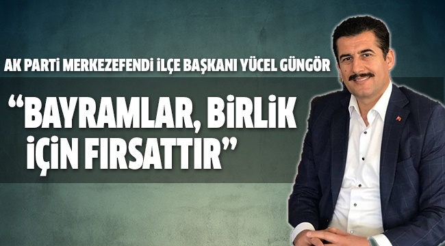 Kurban Bayramı dolayısıyla kutlama mesajı yayınlayan AK Partisi Merkezefendi ilçe Başkanı Yücel Güngör, bayramları fırsat bilerek, birlik, kardeşlik ve hoşgörüyü artırmamız gerektiğini söyledi.