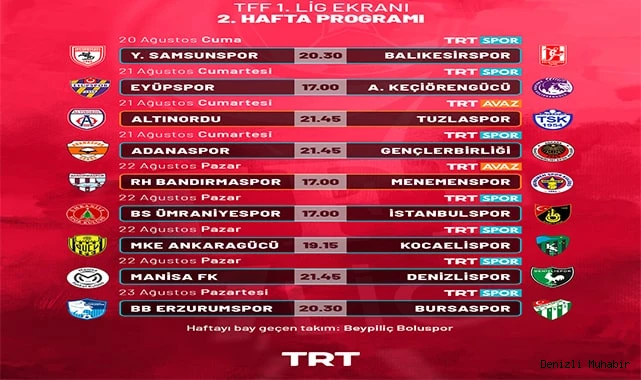 20 Ağustos Cuma günü saat 20.30’da Samsunspor – Balıkesirspor maçı ile başlayacak ligin 2. hafta karşılaşmaları canlı yayınla TRT Spor ve TRT Avaz’da ekrana gelecek.